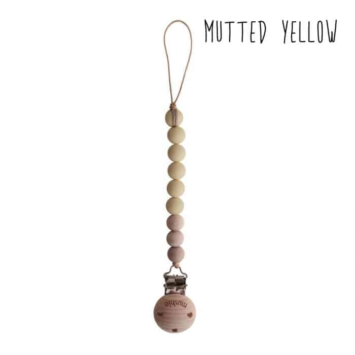 Deze leuke, modieuze speenketting Cleo van het merk Mushie is gemaakt van houten en siliconen kralen.