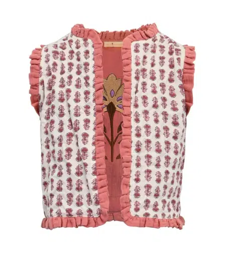 On Top Of The Cake – Gilet Daphne – Reversible Mouwloos Vestje in oud roze. Van katoen stof. Met geborduurde bloem. En bloemetjesprint in Indiase blokprint stijl.