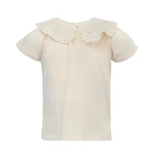 Maak kennis met de romantische Top Dovina – en must-have voor de garderobe van je kind. Deze elegante top in een zachte off white tint straalt eenvoud en verfijning uit. Het absolute hoogtepunt? De grote, geborduurde kraag met speelse broderie-details die elke outfit een romantisch accent geeft.
