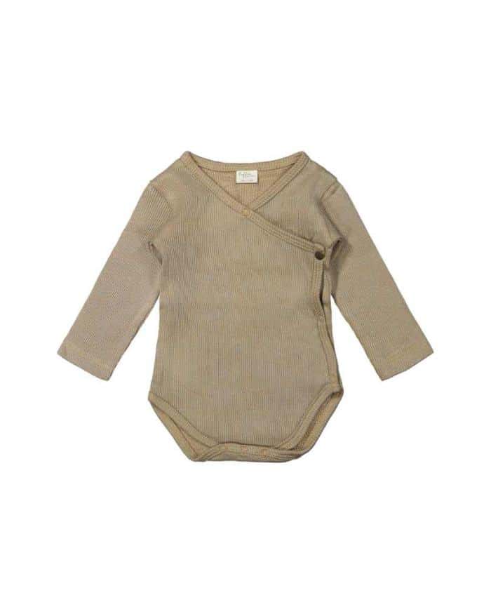 Deze stijlvolle en comfortabele overslagromper met lange mouwen is een echte must-have voor de garderobe van je baby. Gemaakt van een zachte, geribde katoenmix in een warme beige/bruin gemêleerde tint, biedt dit kledingstuk optimaal comfort en gebruiksgemak.