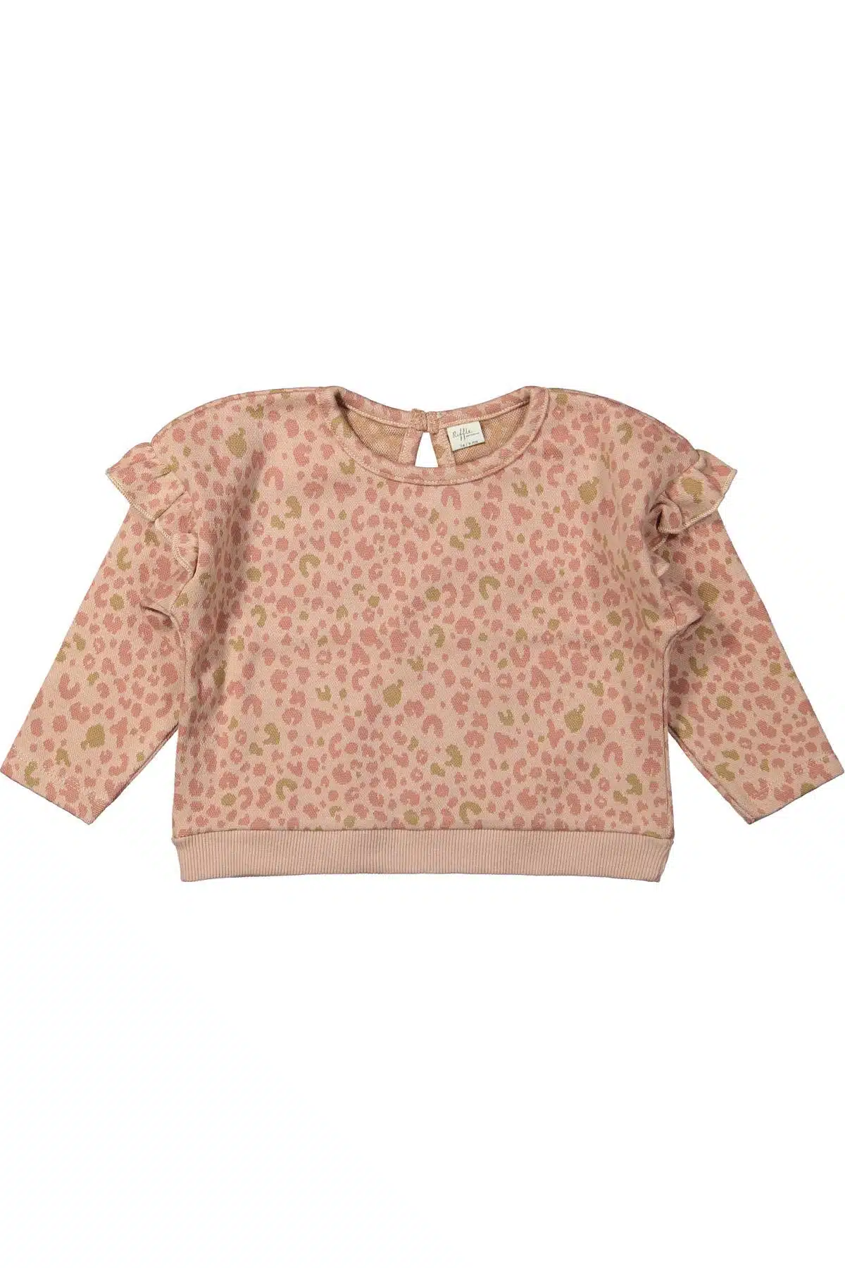 Roze truitje met panterprint voor baby’s. Met schattige ruffles op de schouders.