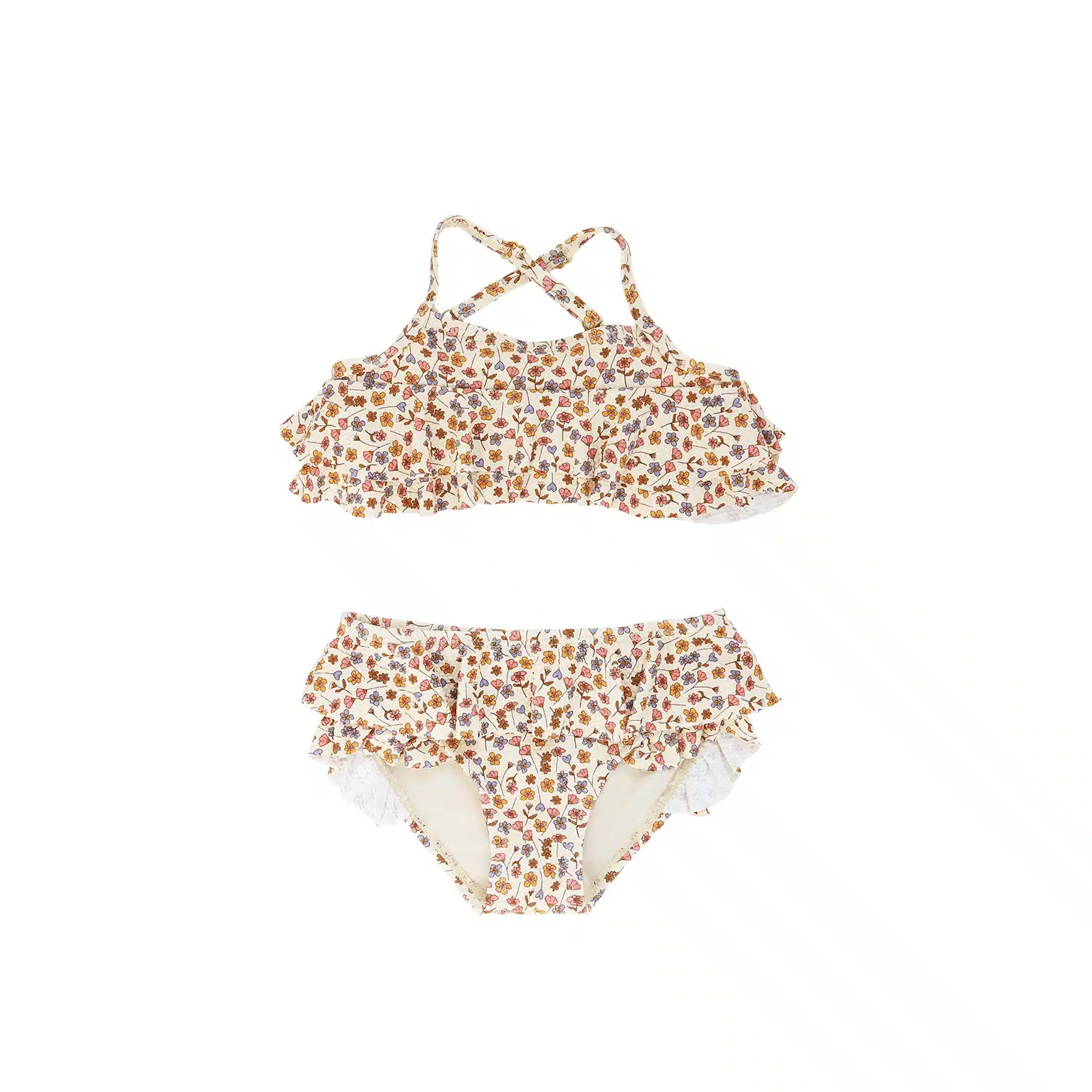 De Salted Stories Flower Bud Bikini handgetekende bloemenprint in zacht beige tint. Heeft speelse ruffles, verstelbare bandjes, en UPF50+ bescherming. Daar fleurt elk meisje van op!